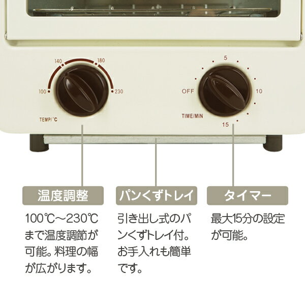 最大15分のタイマー、 100〜230℃まで設定可能な温度調節機能、 用途に合わせて使えるトレイ付き。