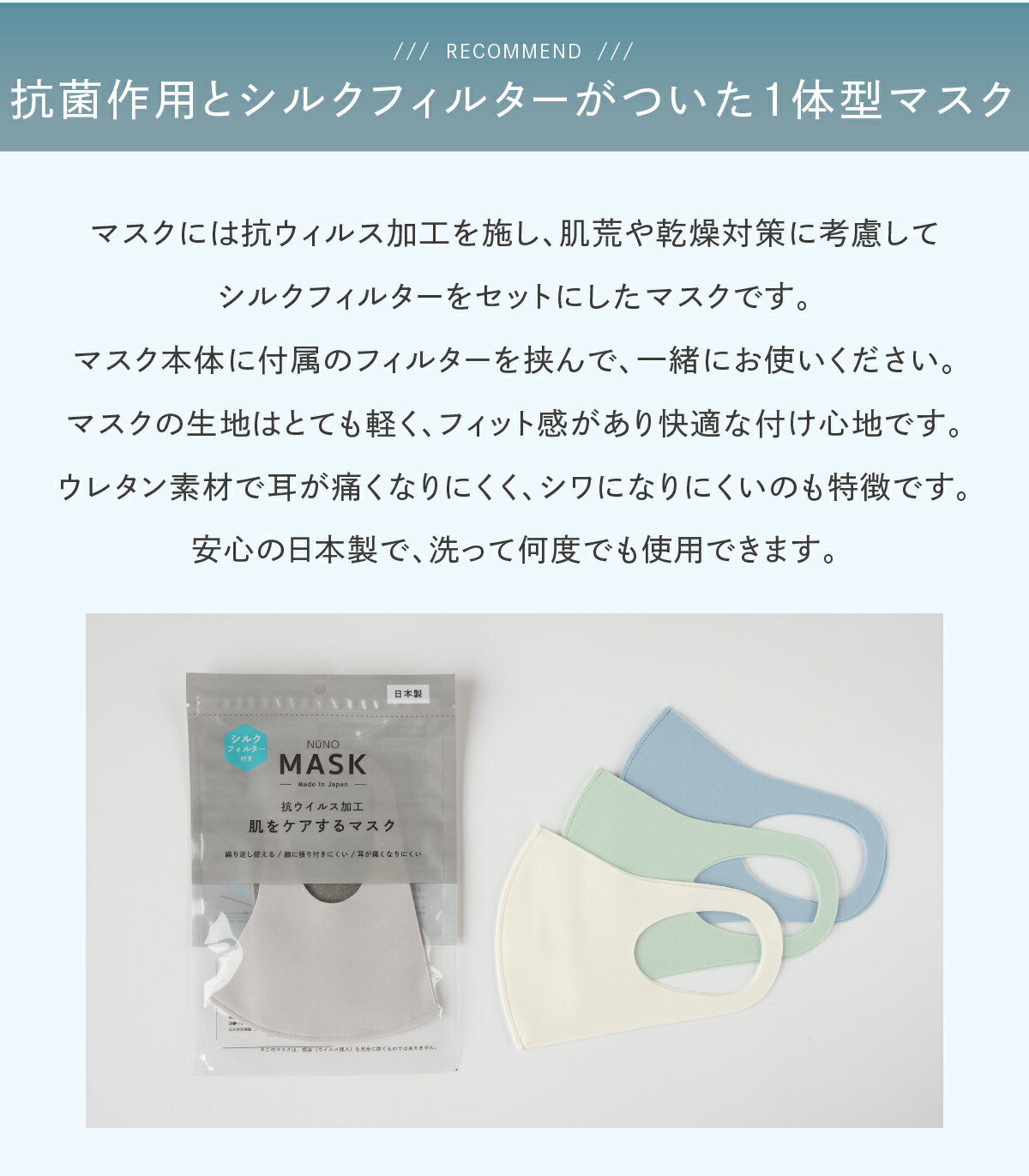 ネコポスについて詳しくはこちら商品名 肌をケアするマスク 抗ウイルス加工・シルクフィルター付き 商品コード SO 6167 サイズ レディース 約23cm~24cm カラー 02.ライトグレー 05.ブラック 07.オフホワイト 22.サーモン 52.ピンク 62.グリーン 64.カーキ 72.サックス 素材 [マスク本体] ポリエステル:90%、ポリウレタン:10% [シルクフィルター] 内側シルク100%、外側ポリウレタン100% 生産地 日本