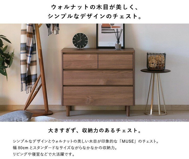 【商品サイズ(mm)】幅800×奥行420×高さ720【カラー】ミディアムブラウン【材質】ウォルナット材【生産国】ベトナム【シリーズ】MUSE-2【備考】本体完成品 ※脚の取付が必要です【特長】チェスト、ローチェスト、たんす、箪笥、タンス、引出、幅80cm、3段、北欧、ブラウン、木製、ウォールナット、オーク、収納、アジャスター、フルスライドレール【代引きについて】こちらの商品は、代引きでの出荷は受け付けておりません。